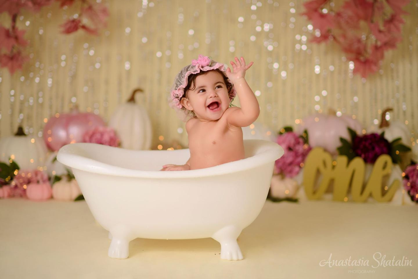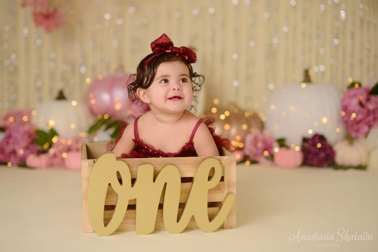 Pumpkins glamourous burgundy pink sparkling cake smash photo shoot Roseville, Rocklin, Folsom, Sacramento, Elk grove, Yuba city. I got a request from the girl’s mom to do a pumpkin-themed cake smash since the girl’s birthday is in the fall, then mom sent me the picture of the dress and I decided to decorate a glamourous pumpkin set up with color matching with the dress.