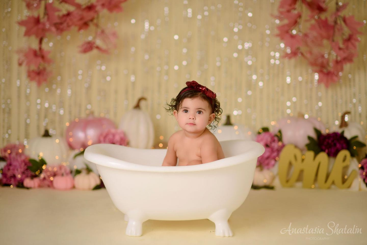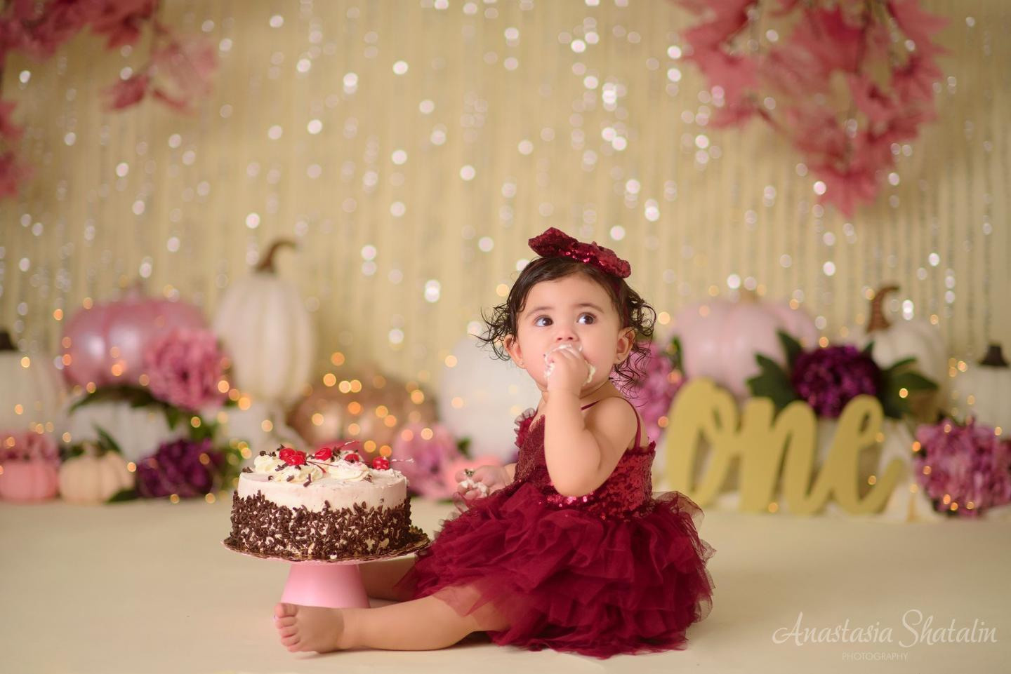 Pumpkins glamourous burgundy pink sparkling cake smash photo shoot